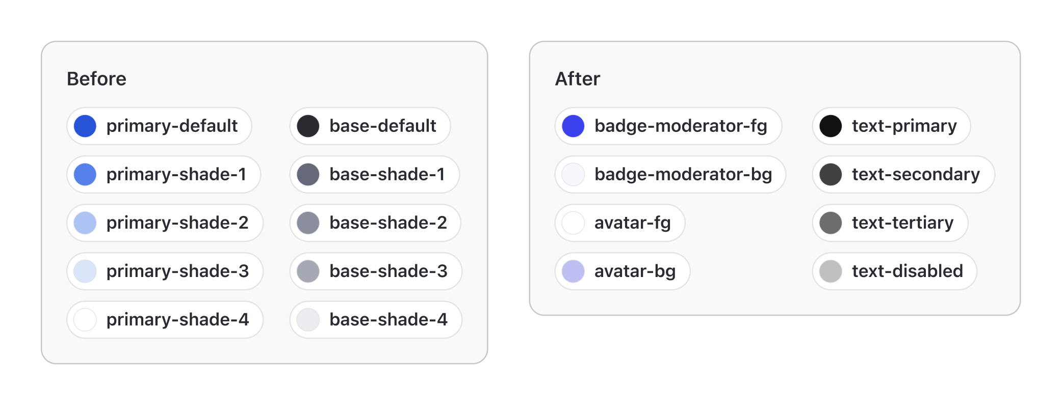 By separating tokens by intent and usage, components are no longer forced to share the same color values. A disabled button and an avatar background can now each map to their own semantic tokens, preserving their distinct roles in both light and dark themes.