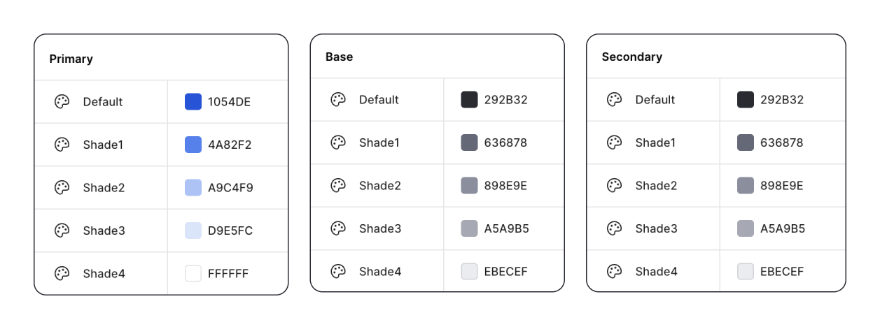 Colors were grouped into Primary, Base, and Secondary, each with 5 arbitrary shades (Default, Shade 1–4). There was no contextual mapping of colors to components, making it difficult for clients to predict how a color change would affect their UI. Clients customizing the UI kit often voiced frustration, saying they didn’t know which variable controlled which parts of the UI.