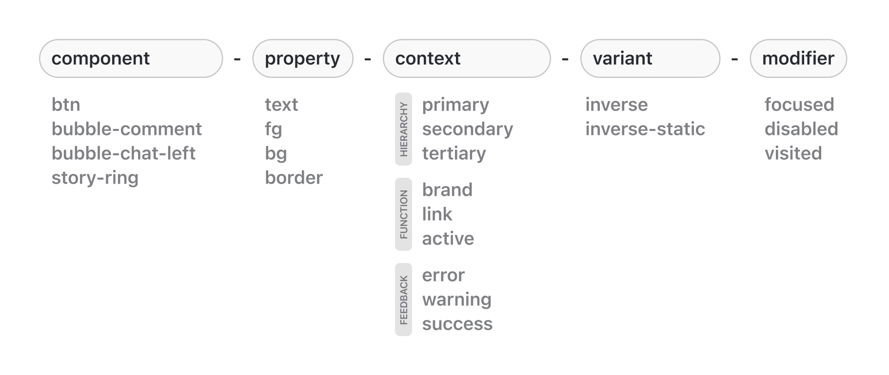 Not every token needs all of these elements. For example, text-primary-inverse-static doesn’t require a component or modifier. But outlining the full structure ensures that when complexity arises, we already have a consistent framework to scale into.