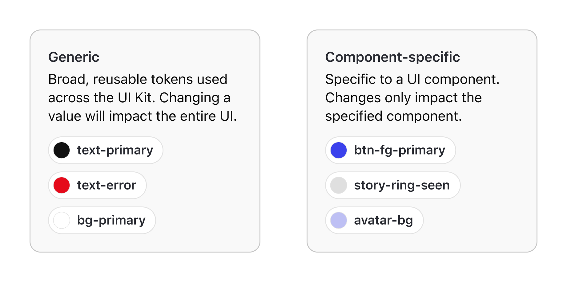 A single token set can’t cover both universal and feature-specific needs — separation is essential. This structure avoids conflicts, supports feature growth, and extends naturally to future non-color customizations like corner radius or spacing.