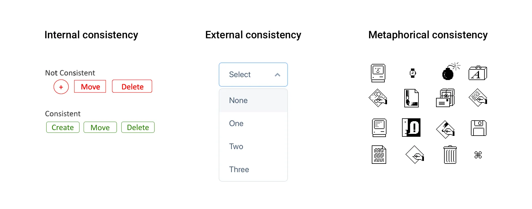 Metaphorical consistency — consistency between your UI and real-world objects. Many interfaces mimic real-world objects — for instance, a “trash can” icon. These mappings help users understand quickly via real-world analogies. But you must use them judiciously, or they can backfire (e.g. IBM’s RealCD project is sometimes cited as a misstep).